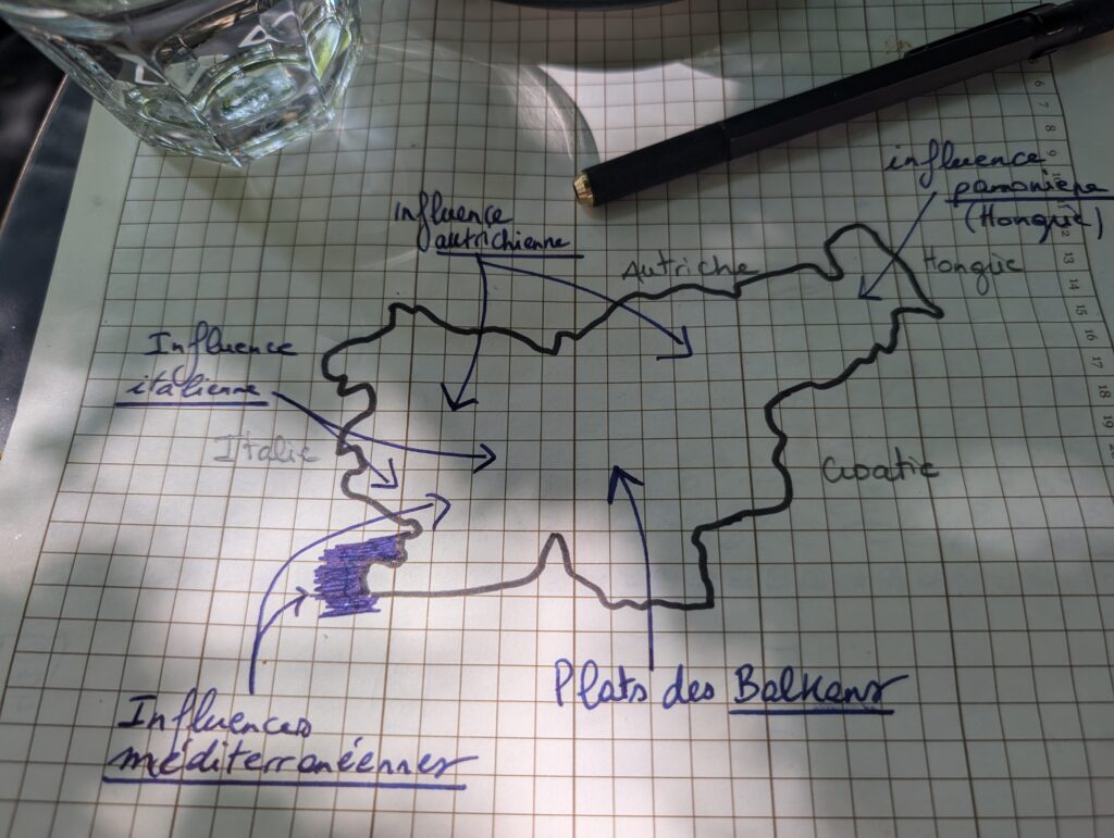 La Slovénie est à un croisement de cultures comme il n’en existe nulle part ailleurs en Europe. La Slovénie est en plus un pays montagneux. Les vallées limitent les échanges et favorisent le développement de cultures et d’habitudes endémiques. C’est ainsi que chaque région limitrophe de la Slovénie a fait évoluer ses traditions culinaires en s’inspirant des recettes du voisin italien, autrichien, croate ou hongrois. Ces échanges ont donné une richesse incroyable à la cuisine régionale slovène, malgré la toute petite taille du territoire slovène (la même que la Picardie).