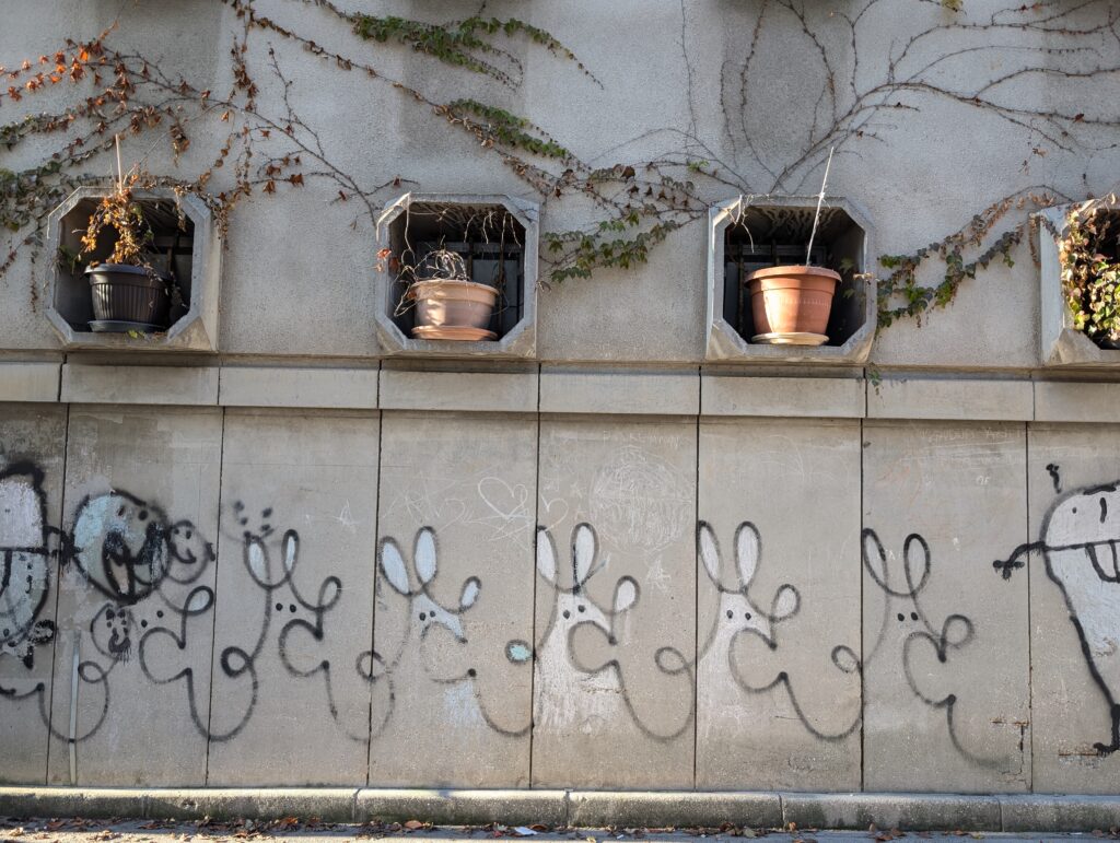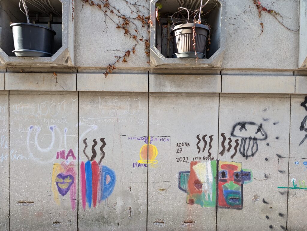 Sur cette œuvre de 2024 qui reprend le cri de Munch, on retrouve les éléments de la place centrale de Ljubljana avec les trois ponts de Plecnik, l’église franciscaine… Je n’ai aperçu ce pochoir qu’une seule fois dans le centre.