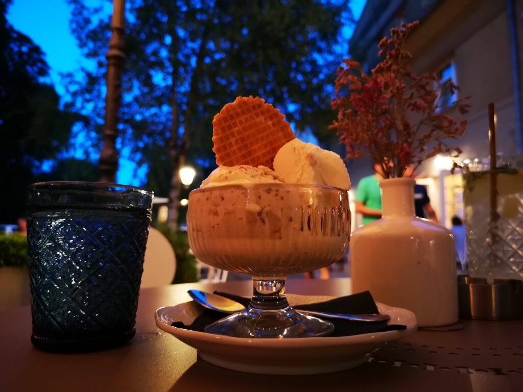 Si vous commandez votre glace assis en terrasse, elle vous serra servie dans un ramequin et avec un verre d’eau si vous le demandez. Comme à Ljubljana, les terrasses le long de la rivière sont incroyablement agréables, je vous conseille de :