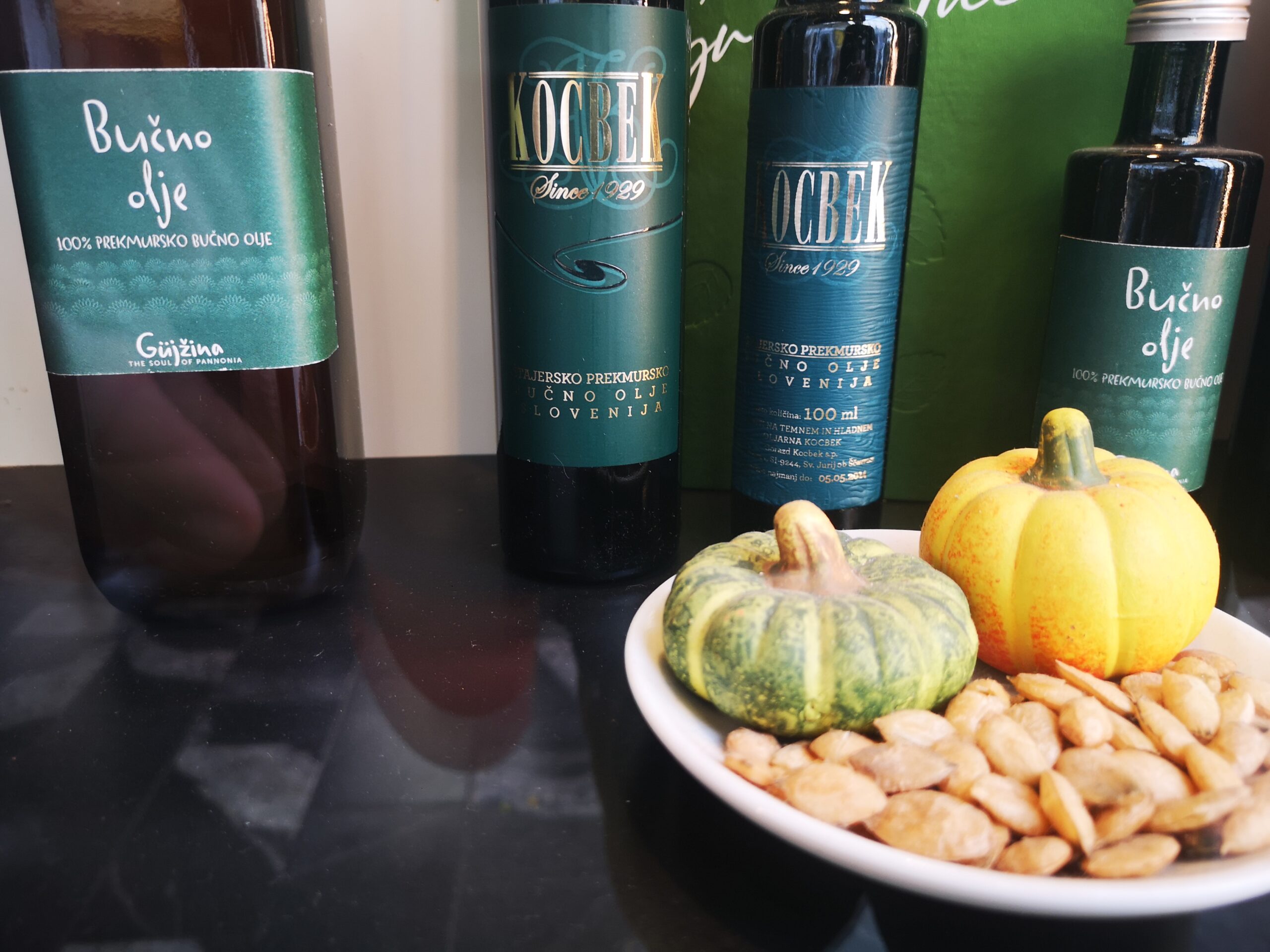 Bucno olje en slovène – huile de pépins de courges en français. Vous la trouverez sur le splendide marché de Ljubljana et dans tous les supermarchés slovènes. On la trouve aussi sur la table dans tous les restaurants slovènes en accompagnement des salades.