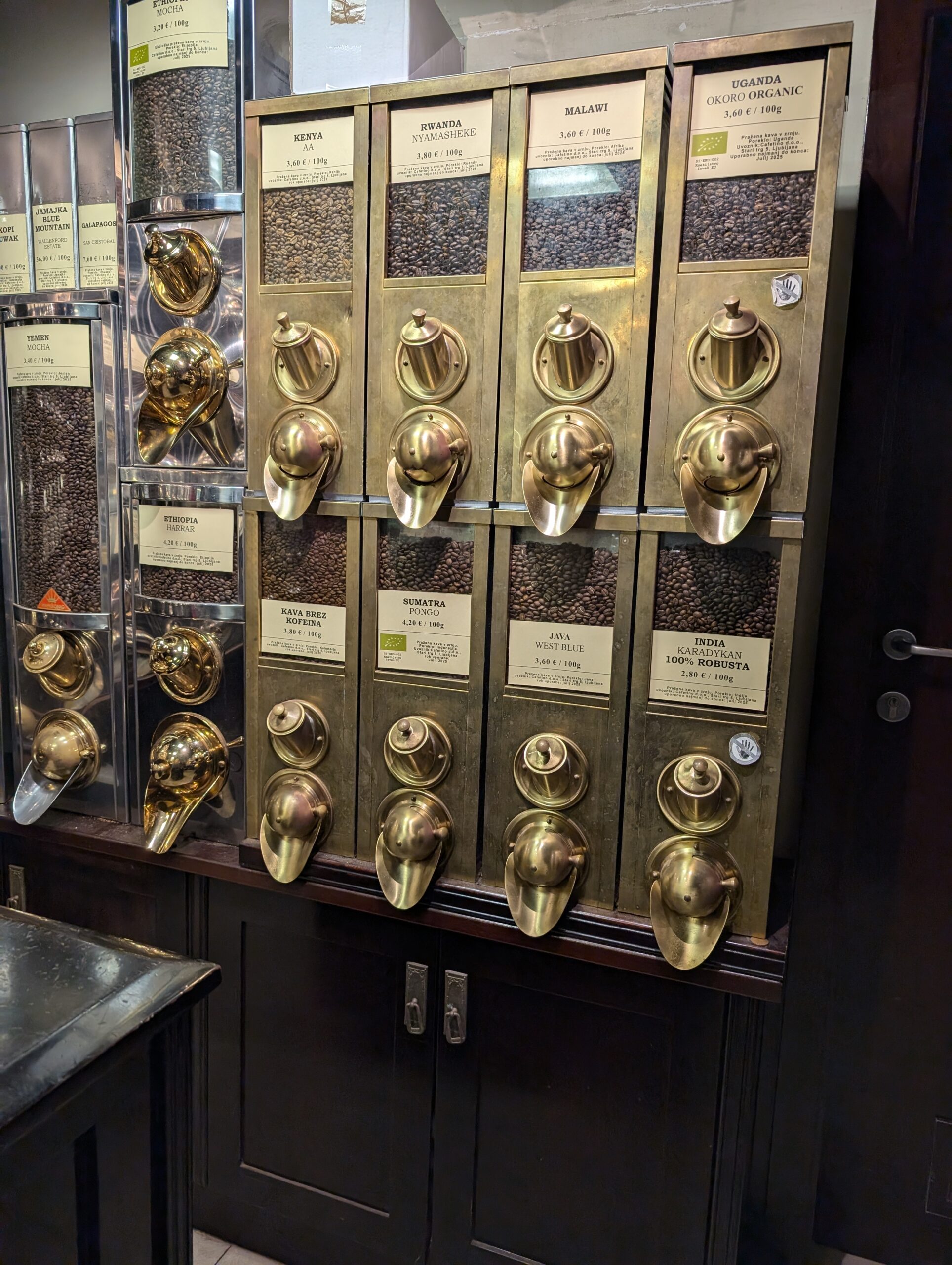 A l’intérieur, vous pouvez acheter du café de différentes origines et le faire moudre.