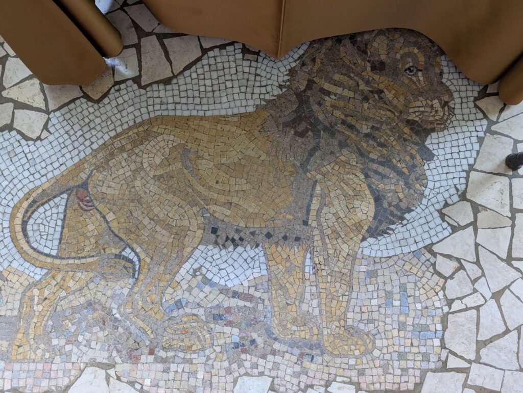 Il y a cette longue et belle mosaïque au mur. Prenez deux minutes pour vous asseoir et l’observer pour voir tous les petits détails, vous poser des questions sur les scènes choisies et ce qu’elle voulaient transmettre. Idem sur la terrasse, personne ne regarde ses pieds mais si vous le faites, vous verrez des mosaïques d’animaux. Idem dans l’entrée, regardez le chandelier et les photos au mur.