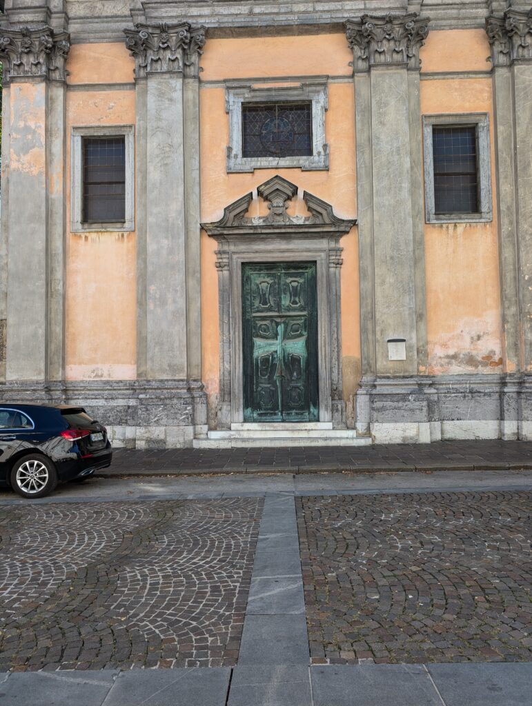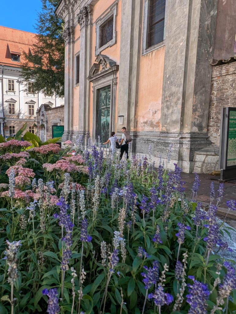 La petite église en face de la galerie se visite. Elle présente parfois des oeuvres d’art comme sur la photo ci-dessus. A gauche, le petit jardin est souvent utilisé pour une oeuvre lors de la svetloba gverilla (la geurilla lumineuse dont je vous ai parlé).