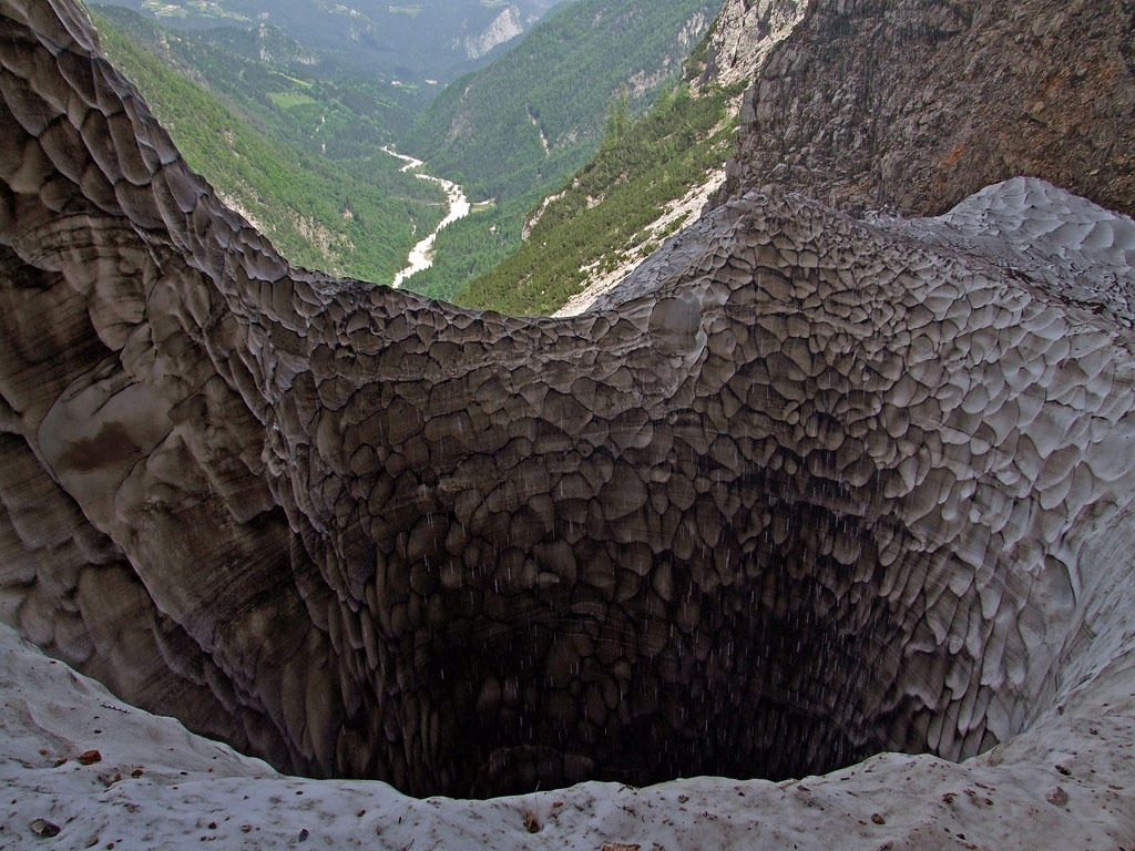 Une formation neigeuse étonnante : Matkov škaf est en fait un entonnoir glaciaire creusé par l’eau de fonte dans un amas de neige qui se forme chaque année au pied d’une face rocheuse. A la fonte des neiges, un puissant ruisseau creuse la neige qui s’est accumulée là pendant tout l’hiver. Ce ruisseau provoque un mouvement tourbillonnaire de l’eau, qui creuse un trou en forme de cylindre profond dans le névé. Il peut faire jusqu’à 20 m de haut ! (N’y tombez pas !)