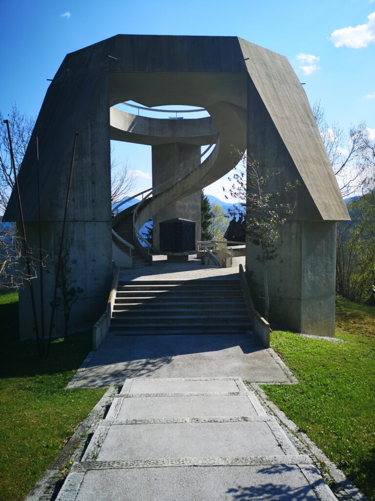 Un cube en béton de 8 mètres de haut, soutenu par neuf colonnes intérieures effilées. Cette structure évoque à la fois les formations karstiques typiques de la Slovénie et les ossements des combattants tombés au combat. Il a été conçu par le sculpteur Janez Lenassi et l’architecte Živa Baraga-Moškon,