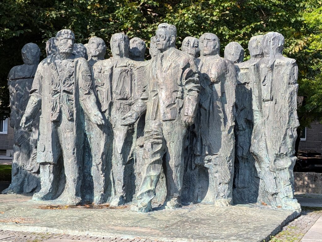 Observez bien !: 15 grandes figures en bronze (environ 2.5 mètres de haut), dont 14 sont anonymes, sans visage, comme une masse uniforme. Seul un homme s’en détache nettement, en marche et sculpté avec précision : Edvard Kardelj. Ce contraste semble symboliser son rôle unique de leader, émergent du groupe.