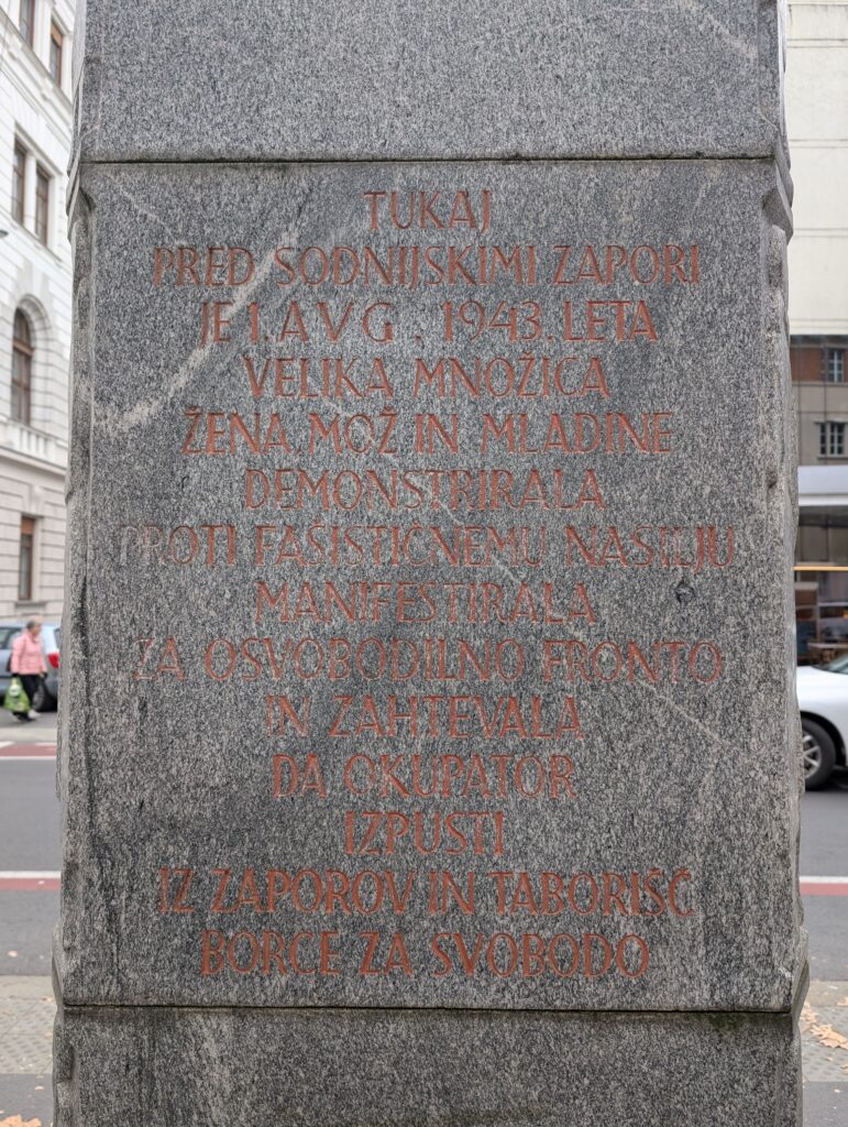 Ce monument rend hommage à des manifestations féminines qui eurent lieu pendant l’occupation de Ljubljana. Ces actions étaient destinées à protester contre l’occupation fasciste / nazie et surtout à exiger la libération de prisonniers politiques ou patriotes, à faire entendre une voix de résistance pour retrouver leur proche ou leur mari.