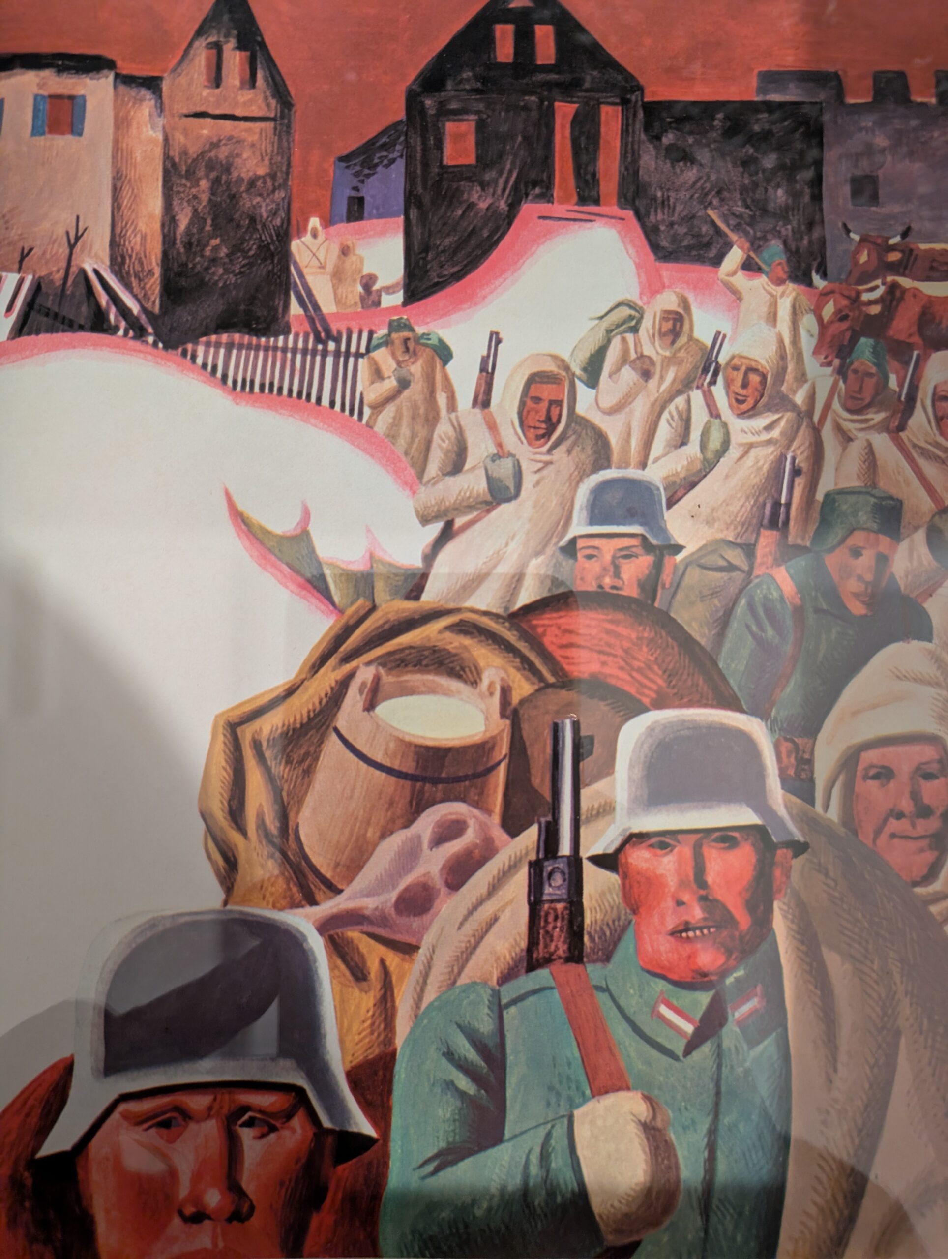 L’œuvre représente une marche hivernale de combattants partisans, encadrée par des arbres sombres, un ciel rougeoyant et un cheval. Le style de Šubic, tantôt stylisé, tantôt narratif, confère une solennité symbolique à la scène — Elle ne témoigne pas uniquement d’un épisode historique, mais invoque le sacrifice, la persévérance et la quête de liberté.