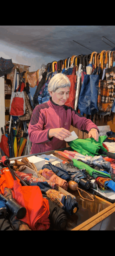 Elle appartient à Marija, l’une des dernières réparatrices de parapluies d’Europe. Comme elle est propriétaire de son local, elle peut se permettre de pratiquer des tarifs modestes.