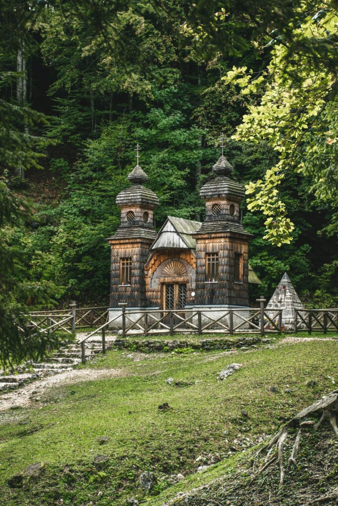 Vous l’apercevrez dans un virage, à 1 100 m d’altitude, si vous montez en voiture ou à vélo les lacets du col de Vrsic, le plus haut col du pays. La Ruska kapelica, ou Chapelle russe, est un monument commémoratif construit en 1916 par des prisonniers de guerre russes. Elle rend hommage à leurs camarades morts dans une avalanche. Ils étaient captifs ici pour construire une route militaire traversant le col.