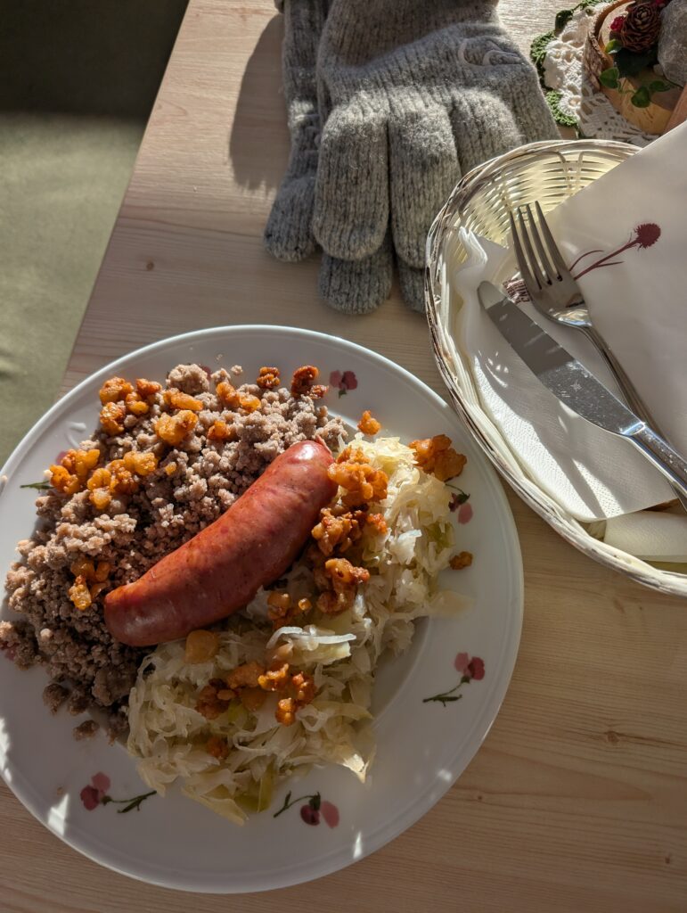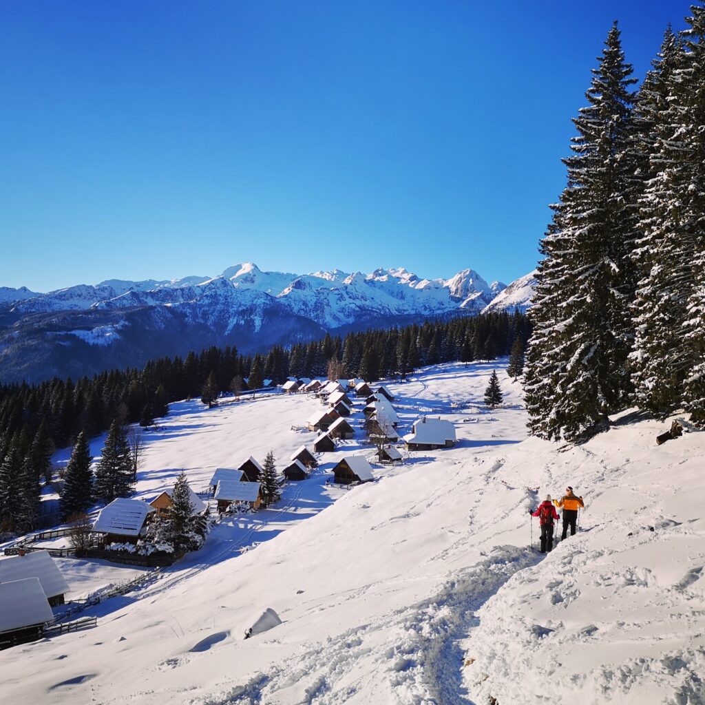 Le deuxième jour est idéal pour une randonnée facile vers le magnifique hameau de Zajamniki. Comptez environ 1h30 de marche à l’aller, sans difficulté technique. En hiver, le paysage est somptueux : les petites huttes en bois alignées dans l’alpage, la neige, la vue sur le Triglav. Le retour à Uskovnica se fait sans se presser, avec l’idée en tête qu’il n’y a rien d’urgent. On se rechauffe au refuge près du poêle. Un goûter , un livre, une discussion avec quelques randonneurs slovènes de passage, puis un nouveau dîner au chaud. Le genre de journée dont on se souvient.