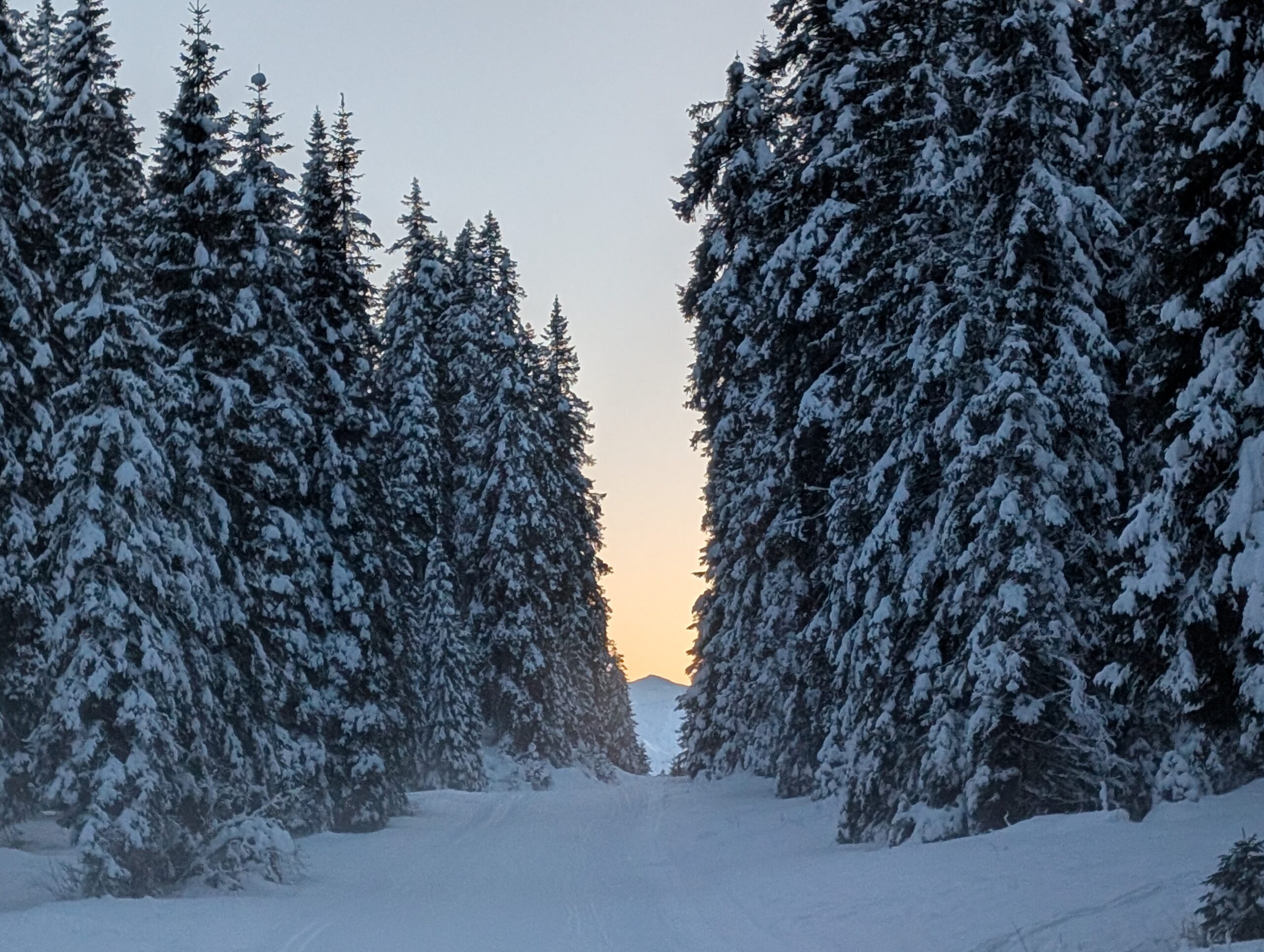 À l’arrivée au village, le contraste est immédiat. Une trentaine de maisons en bois, l’église, la prairie. Rien d’autre. Installez-vous au refuge, déjeunez ou on buvez quelque chose de chaud, puis prenez le temps de vous promener dans le village, d’observer la lumière sur la neige, d’écouter le silence des lieux. Le premier coucher de soleil sera un autre moment fort.
