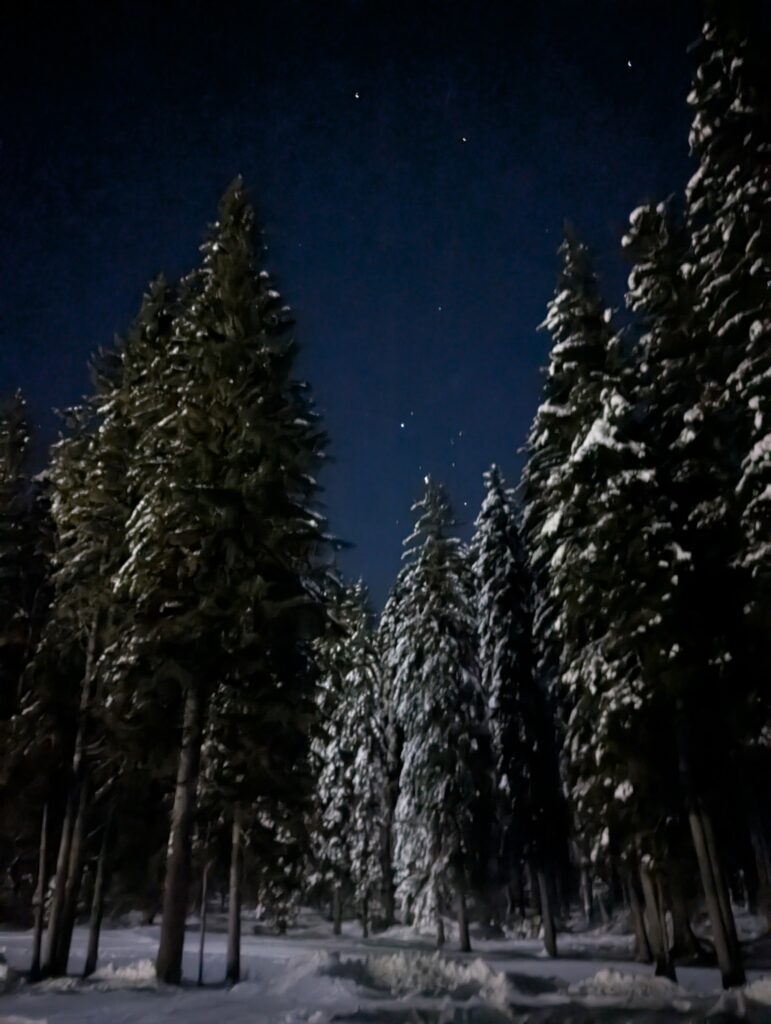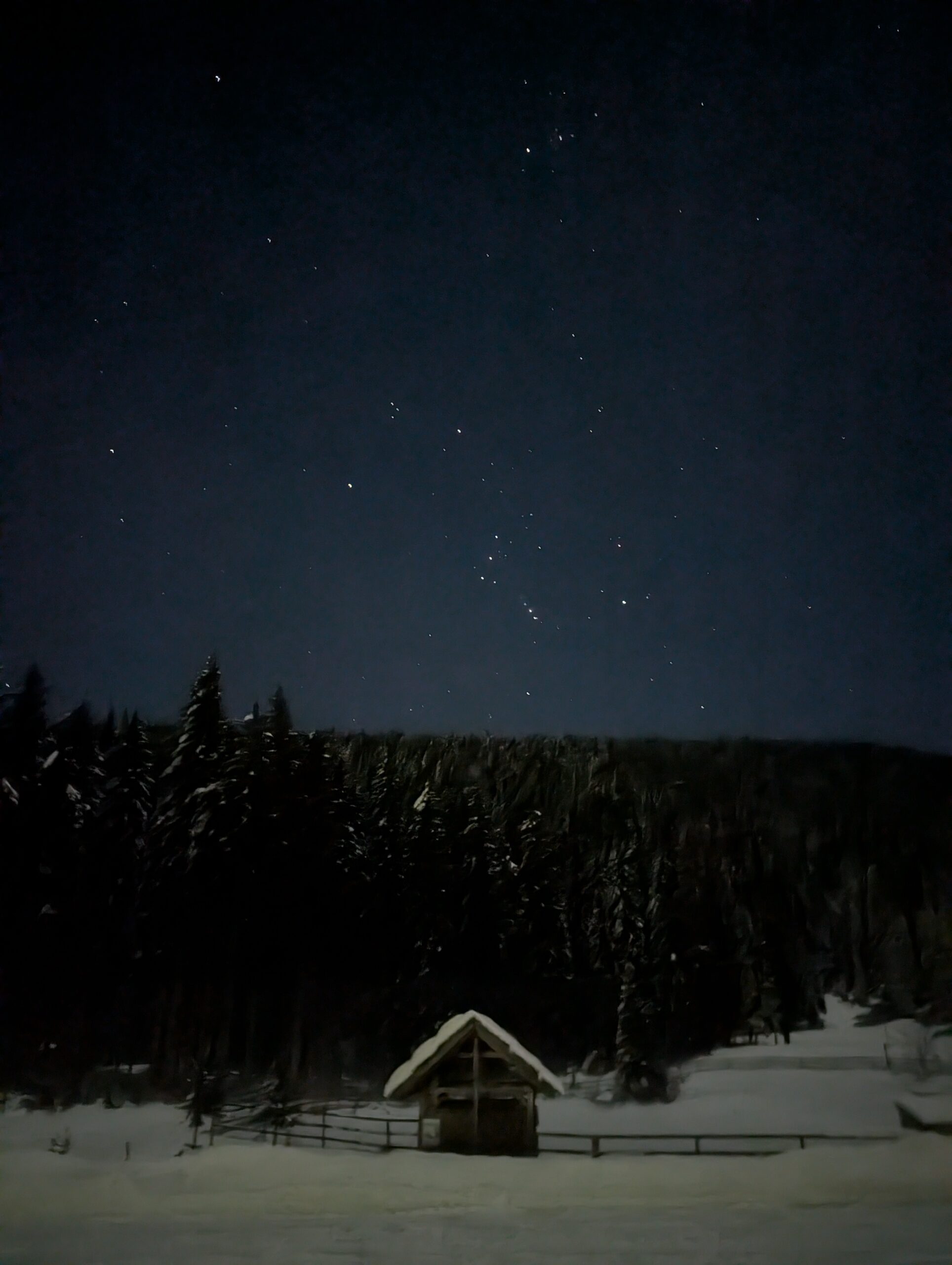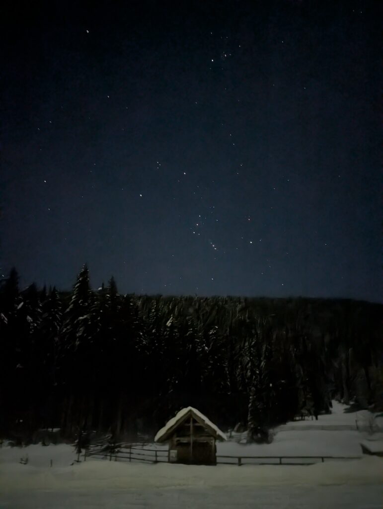 Le soir, quand la nuit tombe, Uskovnica offre un moment que je trouve magique. Pas de pollution lumineuse, pas de bruit. On sort quelques minutes après le dîner, emmitouflé, et on lève les yeux. Le ciel est souvent spectaculaire. Les étoiles sont bien plus nombreuses qu’en ville. Marcher seul dans la prairie enneigée, lampe frontale éteinte, est un moment rare dont vous vous souviendrez et très facile à faire. Aucune difficulté.