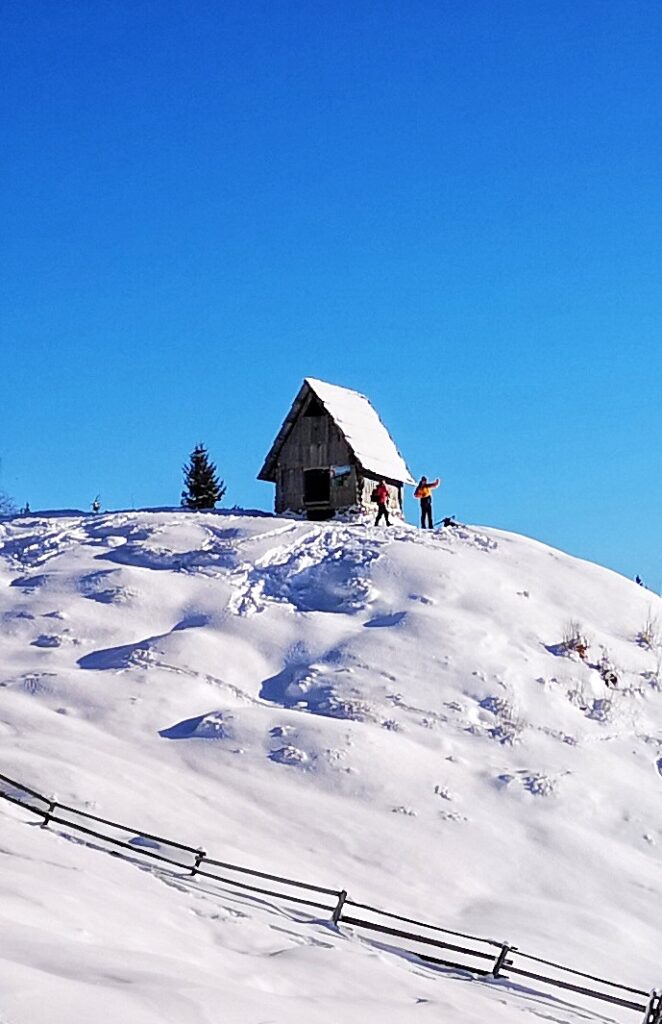 On y trouve un refuge chaleureux en bois rénové très récemment. Ici, pas de circulation, pas de bruit. Juste la neige, le silence, le feu du poêle du refuge et les Alpes juliennes qui vous entourent.