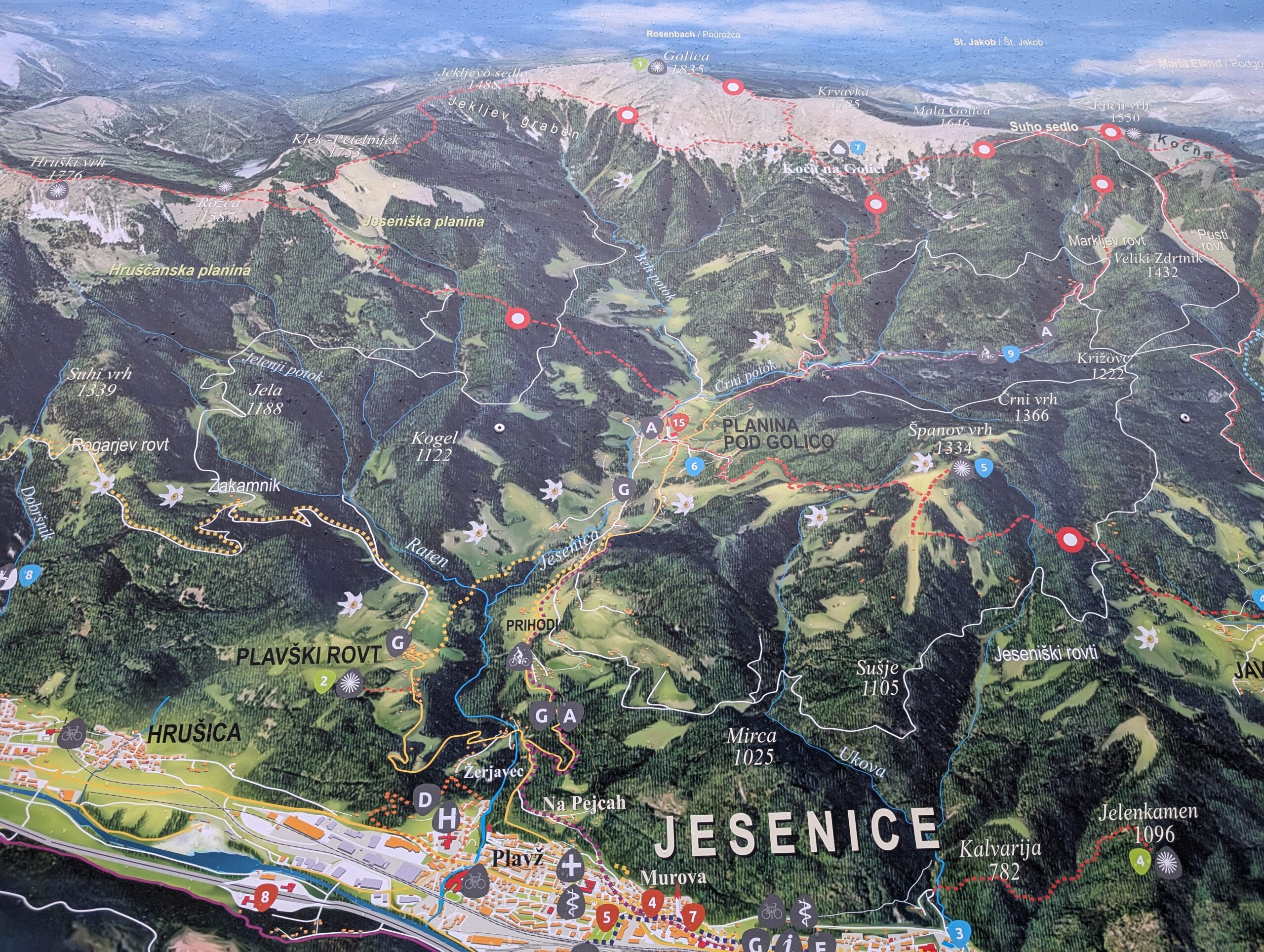 Logez dans le petit village de Planina pod Golico, de là, vous pourrez partir pour deux belles randonnées sur les chemins rouges que vous voyez sur la carte.